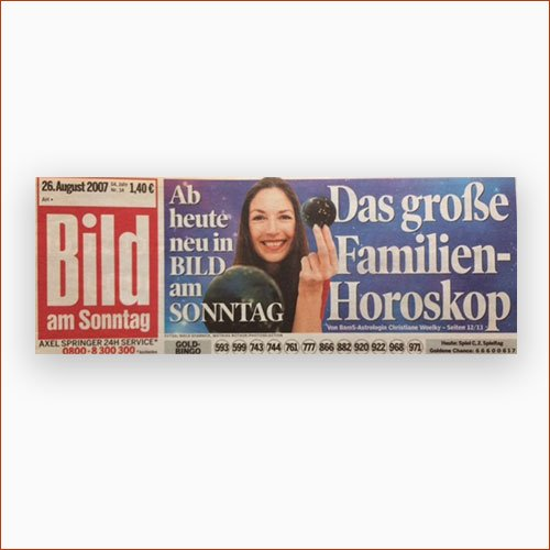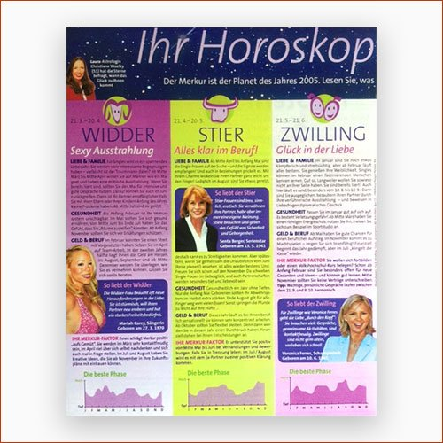 - Interviews, Prognosen, Prominentenhoroskope bei „BRISANT“ (ARD), bei „BLITZ“ (SAT.1)